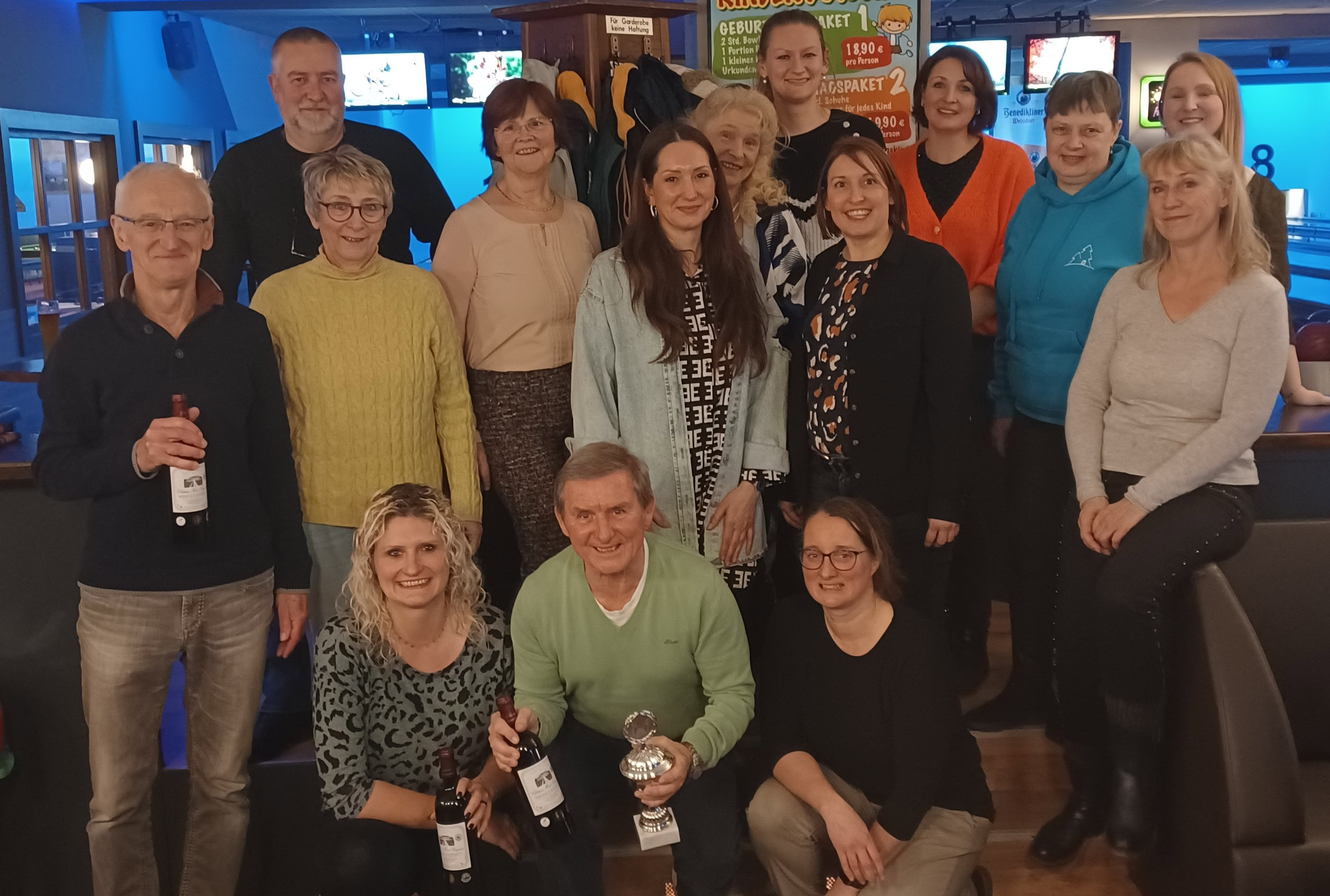 Nach ca. zwei Stunden standen die Gewinner des Bowling-Turniers fest: Platz 1 bei den Damen belegte Siri Walter mit 158 Punkten. Mit 151 bzw. 129 Punkten folgten Carolin Hartmann und Bettina Blechschmidt-Ziegenfelder auf den Plätzen 2 und 3. Bei den Herren eroberte sich Gerd Maier den 1. Platz mit 188 Punkten. Peter Nowicki mit 143 und Theo Hoke mit 120 Zählern kamen auf den 2. und 3. Platz.